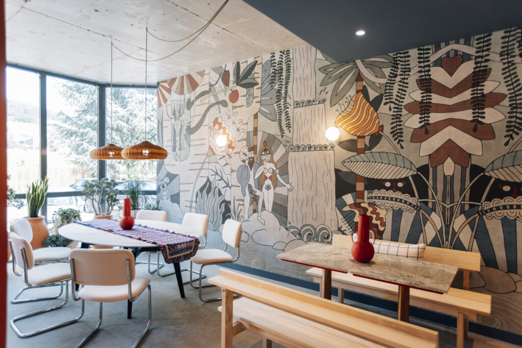 Vous apprécierez notre carte de burgers et frites faits maison, sur place ou à emporter ! Découvrez aussi nos planches pour accompagner vos apéritifs. Côté déco, le papier peint « aux jardins des délices » avec Adam et Eve qui vont croquer la pomme, les chaises françaises et incontournables 510 originale, du marbre, du granit pour une ambiance moderne et ludique.
