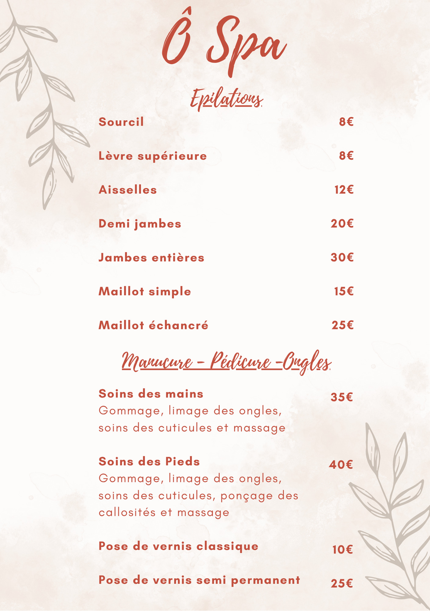 Profitez également de nos offres gommages, massages, soins du visage et épilations pour compléter votre expérience. Consultez la carte des soins pour personnaliser votre moment de détente.